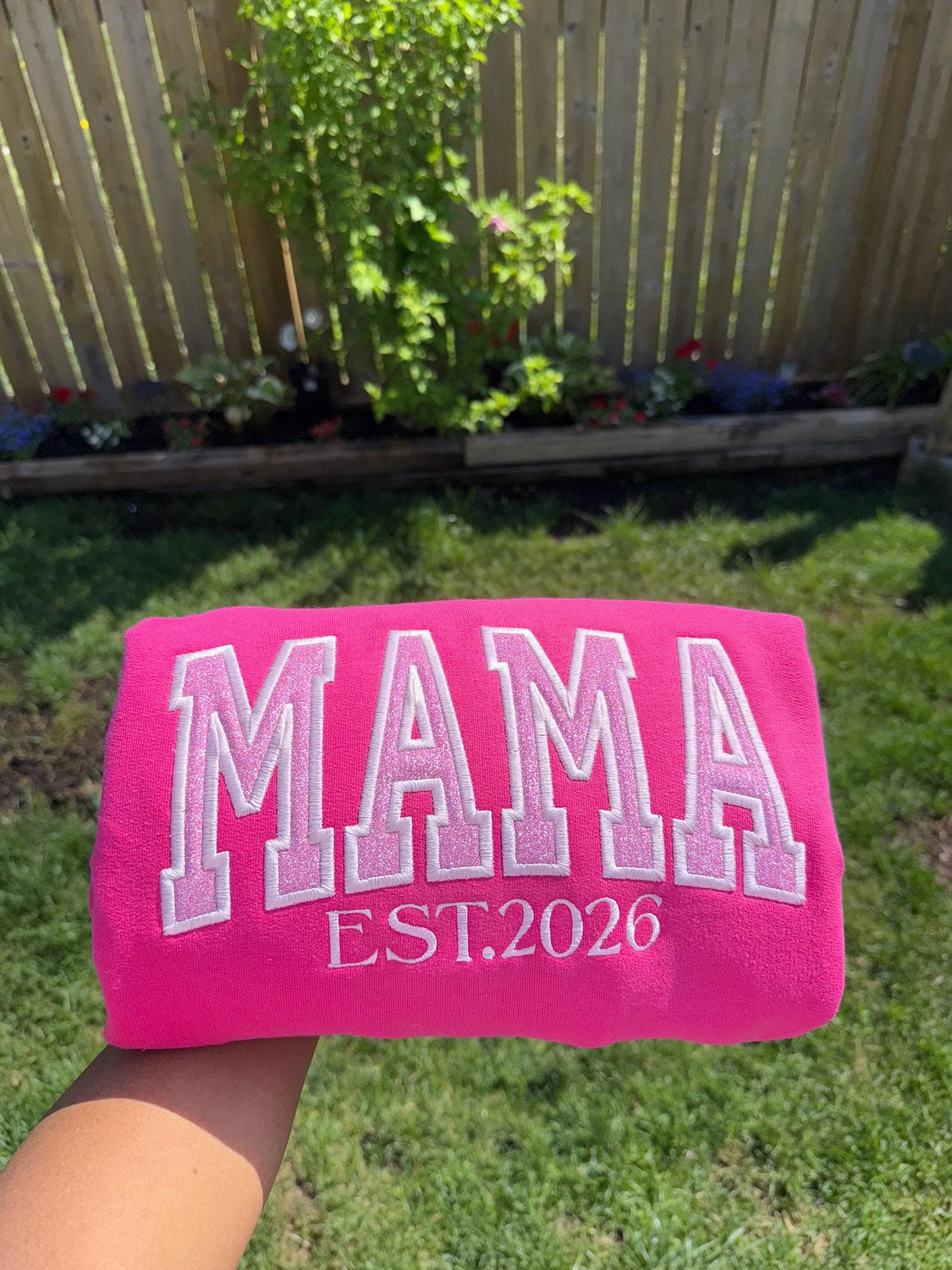 Each sweatshirt features bold “MAMA” varsity letters paired with your custom EST. year, beautifully embroidered with a shimmering glitter outline. Every stitch is crafted with love to create a keepsake that’s warm, empowering, and uniquely yours.